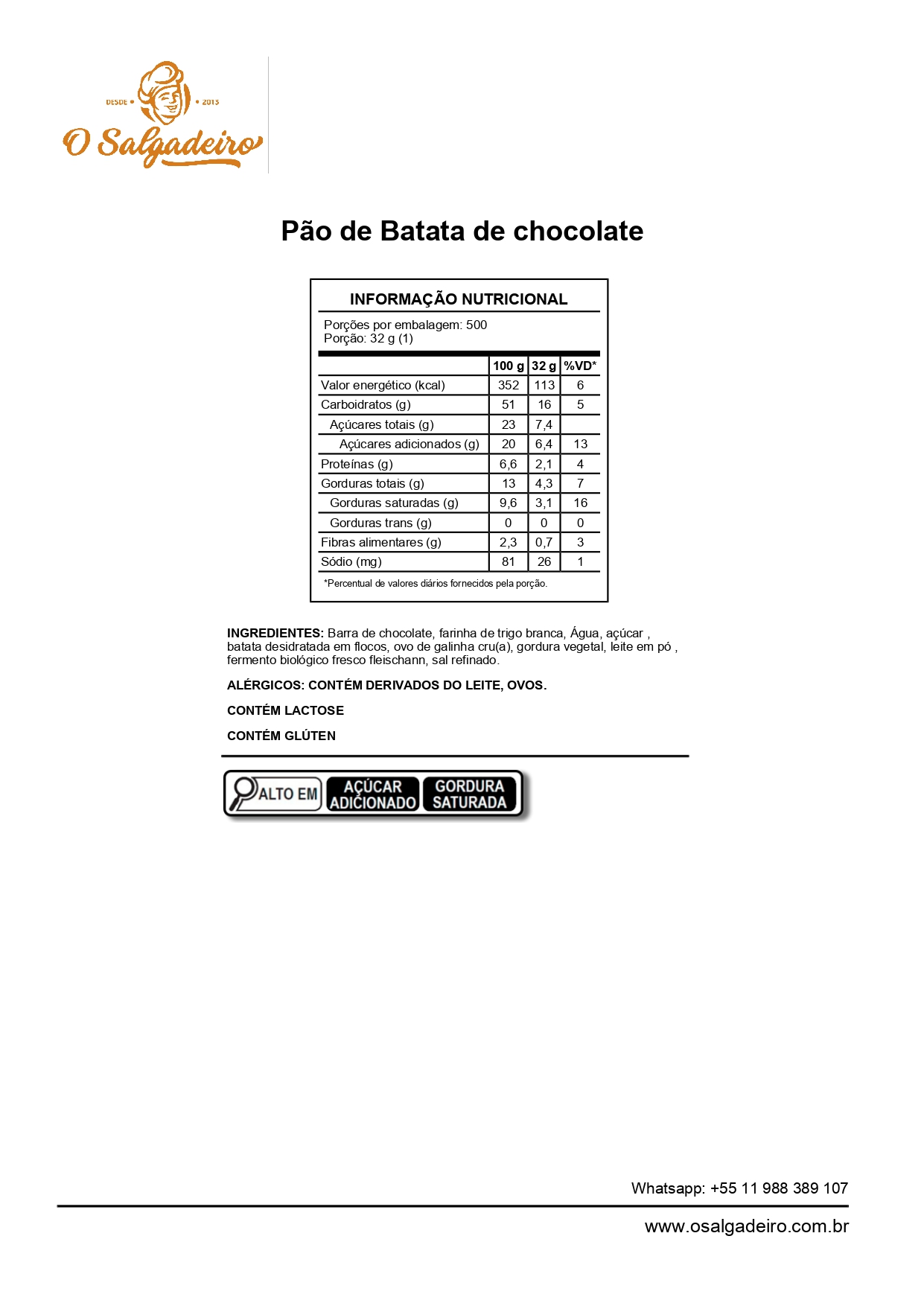 Massa de farinha de trigo com batata flocada belga de consistência extra macia, recheado com chocolate meio amargo, proporcionando uma contraste ideal entre massa e recheio. Produto entregue assado e congelado, necessário aquecer para o consumo. Pacote com 500 gramas, aproximadamente 13 a 15 unidades